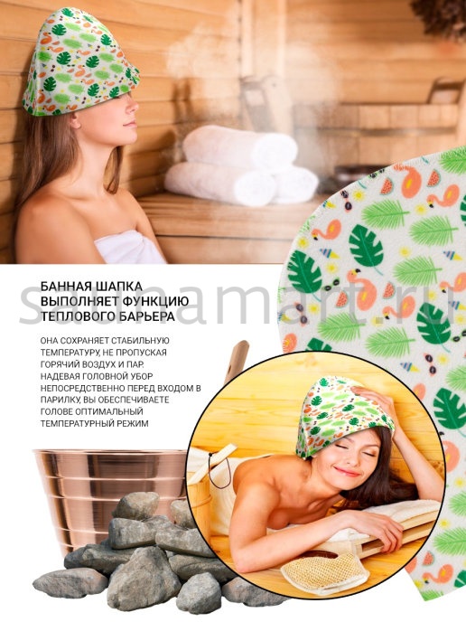 Шапка это необходимый атрибут для похода в баню или сауну. Высокая температура и сухой воздух в парной могут вызвать перегрев и ожоги кожи головы. Шапка для бани убережет голову, уши и волосы от высокой температуры и перегрева. Если пренебрегать защитой головы с помощью шапочки, то волосы теряют влагу и становятся ломкими и сухими. Помимо термоизоляционных свойств банная шапка обладает отличными гигроскопичными свойствами - прекрасно впитывает влагу и пот, что сделает Ваше пребывание в парной более комфортным. Головной убор для бани выполнен из натурального материала – войлок. Материал достаточно пористый, за счет чего создает своеобразный защитный барьер  по принципу термоса, для изоляции от высокой температуры. Стильный, яркий, необычный рисунок выделит Вас и подчеркнет Вашу индивидуальность. После применения расправьте шапку и просушите. Размер универсальный. Мы предлагаем Вам не только эффективное  средство защиты от перегрева, но и стильный яркий аксессуар для бани и сауны.