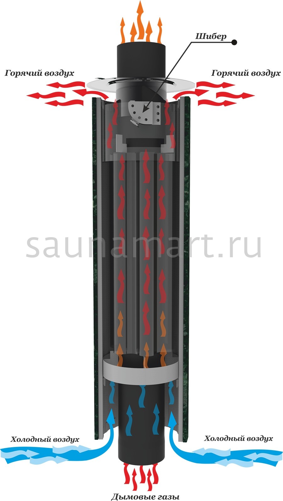 Дымоход-конвектор — это специальный модуль дымоходной системы, предназначенный для повышения теплоотдачи за счет организации воздушного теплообмена. Изготавливается из жаропрочной нержавеющей стали (AISI 304/316) с перфорированным внешним кожухом и внутренним утеплением базальтовой ватой (толщиной 30-50 мм). Имеет цилиндрическую форму с наружными ребрами или пластинами, увеличивающими площадь теплообмена. Принцип работы основан на естественной конвекции: холодный воздух поступает через нижние отверстия, нагревается от стенок трубы и поднимается вверх, создавая дополнительный тепловой поток. Такая конструкция позволяет отбирать до 20-30% тепла уходящих газов, повышая общий КПД отопительной системы. Дымоход-конвектор совместим с большинством печей (диаметр подключения 115-200 мм), сохраняя при этом нормальную тягу. Отличается устойчивостью к высоким температурам (до +600°C) и коррозии, а также простотой монтажа (стыкуется с обычными сэндвич-трубами). Рекомендуется для установки в жилых помещениях, где важно эффективное использование тепла.