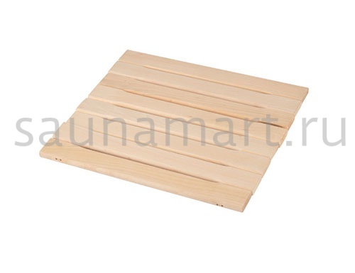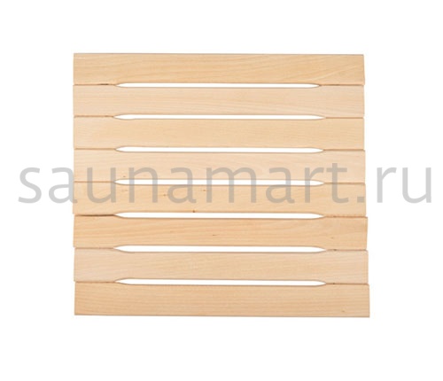 Коврик выполнен из отдельных фрагментов древесины. Этот аксессуар для бани имеет привлекательный внешний вид, внося дополнительные штрихи в интерьер парильного помещения.