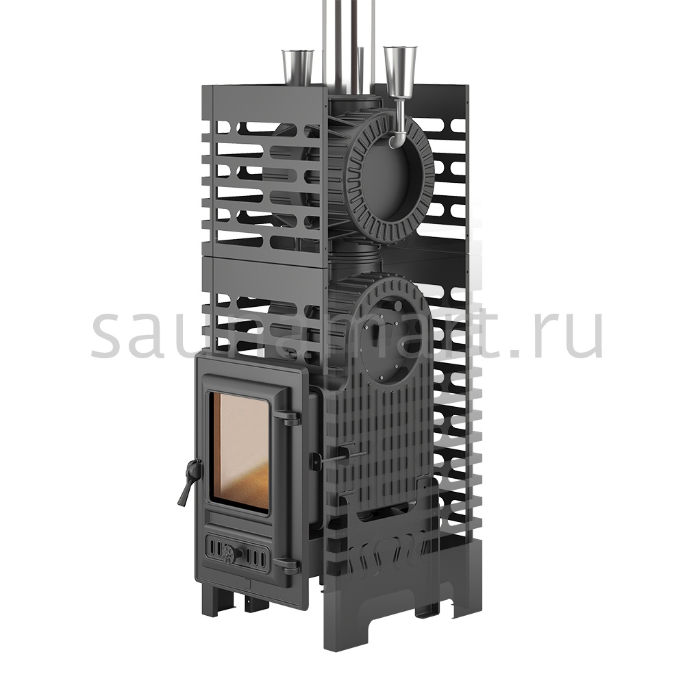 Комплект состоит из чугунной банной печи Астон Шторм 18 и чугунной натрубной каменки Турбопар. Объединение двух конструкций в единую систему заметно увеличивает тепловую отдачу термоагрегата, предотвращает перегрев дымохода, организует дополнительную каменку для получения качественного пара.