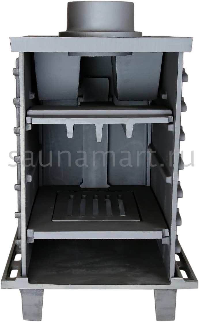 Особенностью модели является высокая кованая стальная сетка для камней, усиленная каменка большой массы, а также чугунный короб и стартовая труба длиной 500 мм. Дверцы оборудованы жаростойким стеклом фирмы SHOTT ROBAX (Германия) и керамическим уплотнителем, обеспечивая долговечность и безопасность эксплуатации. Печь легко модернизируется до полноценной печи для режима «Русская баня» путем замены стальной сетки на каменную облицовку без демонтажа дымохода.