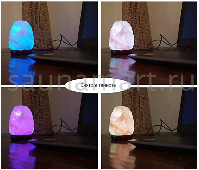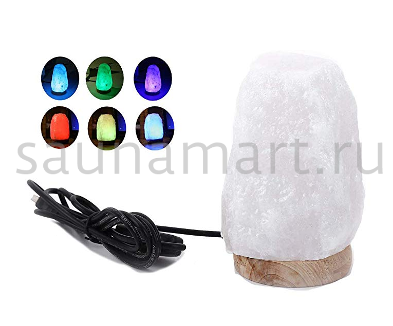 Гималайская соляная лампа с деревянной подставкой, многоцветная с изменением цвета на 7 цветов. Эта солевая мини лампа с USB разъемом для питания от порта компьютера сделана из настоящей Гималайской соли.