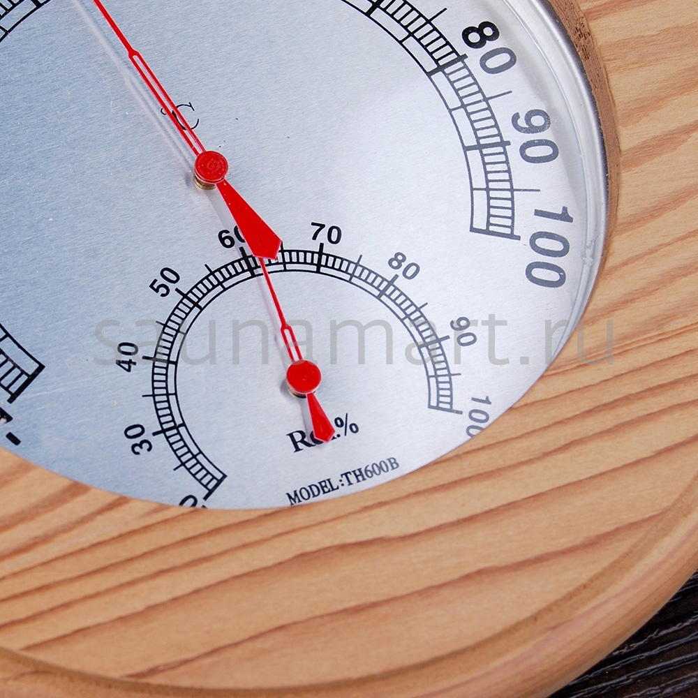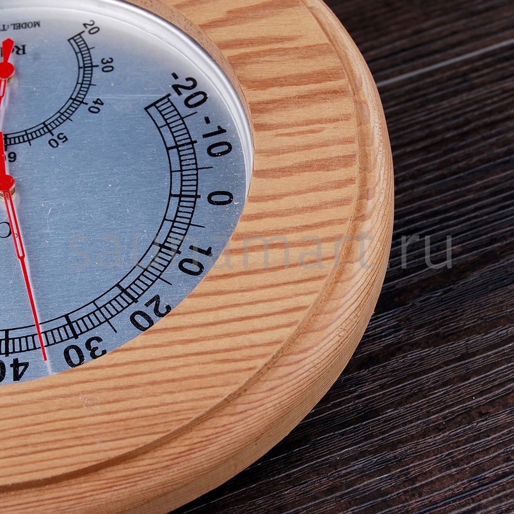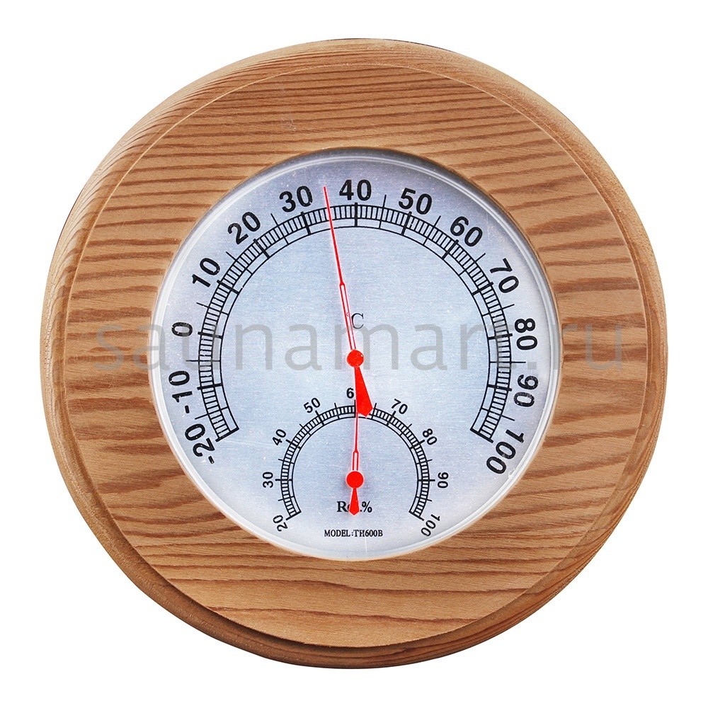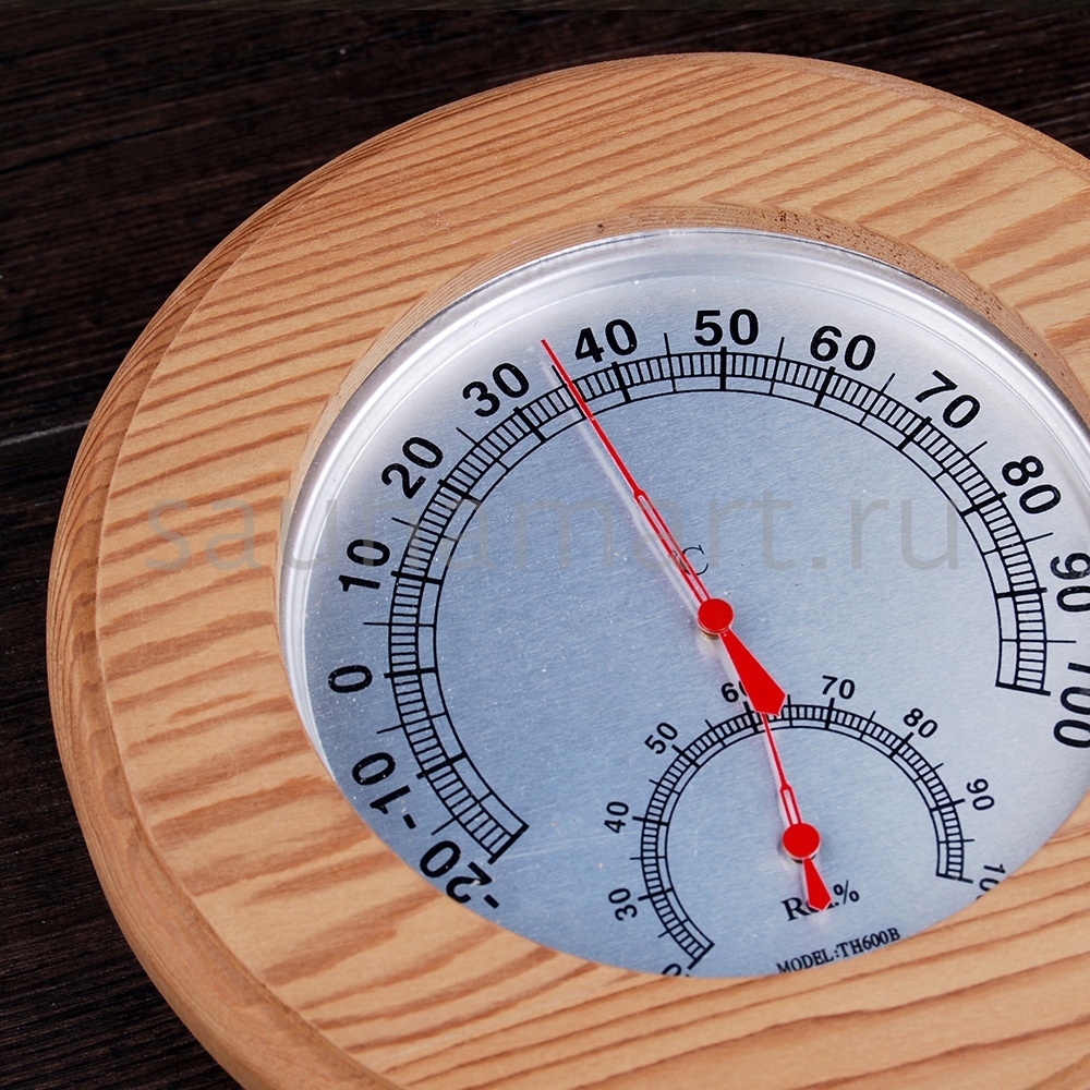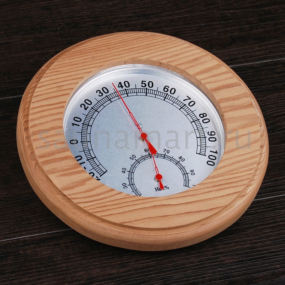 Термогигрометр имеет оригинальную круглую форму. В широкой рамке из древесины кедра находится циферблат, который сообщит о температуре воздуха. Данный прибор прекрасно подойдёт для использования в парной. Максимально допустимая для измерения температура составляет 120 градусов Цельсия. Этого максимума достаточно для комфортных банных процедур. Нагнетание в парном помещении большей температуры нежелательно, так как может быть опасным для здоровья. Благодаря универсальному дизайну термометр станет прекрасным дополнением любого интерьера.
