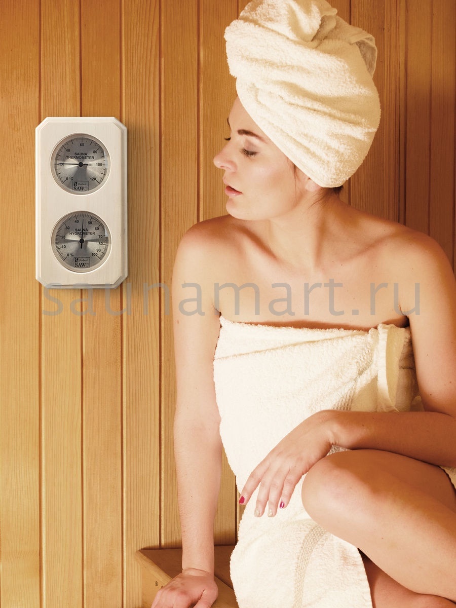 Термометр-гигрометр Sawo для саун сочетает в себе две полезные функции – измерение температуры и влажности воздуха. Вас непременно порадует качество и внешний вид прибора. Лучшим местом для установки прибора является наиболее удалённая стена относительно входа и печи. Укреплять его следует на высоте 1,5м от пола.