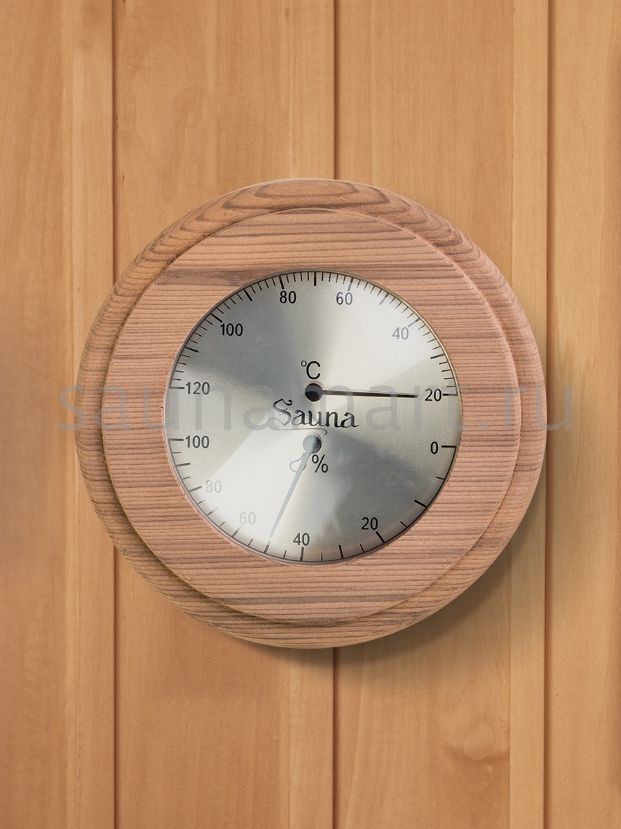 Термогигрометр SAWO 231-ТНD отличается надежностью, долговечностью и практичностью. Корпус прибора выполнен из кедра, очень прочного материала, который не выделяет смолы. Диаметр 18,5 см. В широкой раме из кедра находится круглый циферблат, под термостойким стеклом, разделенный на 2 шкалы. Градуировка шкалы гигрометра варьируется в пределах от 0 до 100 %. Градуировка шкалы термометра варьируется в пределах от 0 до 120 градусов по Цельсию. Предусмотрена возможность калибровки прибора. Термогигрометр SAWO прекрасно впишется в интерьер любой бани или сауны и удачно дополнит интерьер. Термогигрометр Саво подойдет для использования в любом парильном помещении, как в условиях русской бани, финской сауны так и хамама. Помните, чтобы проведённое в парной время оказало благоприятный эффект на здоровье и самочувствие, необходимо тщательно соблюдать температурный режим парения и режим влажности. Высокий стандарт качества SAWO гарантирует надёжность и точность измерений термо-гигрометра.