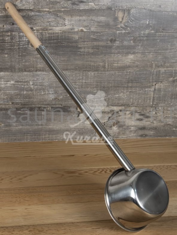 Большой, практичный и долговечный металлический ковш с ручкой из натуральной древесины для бани и сауны.