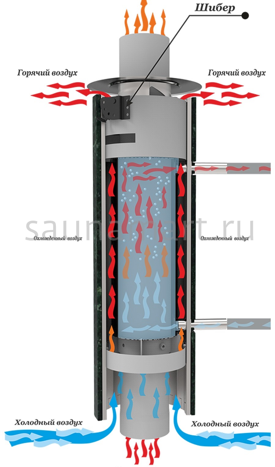 Дымоход с регистром – комбинированная конструкция, объединяющая дымоотводящий канал и водяной теплообменник. Выполняется из жаропрочной стали (3-5 мм) с приваренными трубами или пластинчатыми секциями, образуя прямоугольный или цилиндрический корпус. Подключается к системе отопления через патрубки (диаметром 1-1.5"), позволяя нагревать воду до 70-80°C. Особенности: обязательное наличие расширительного бака, рекомендуется для помещений площадью свыше 100 м?. Минимальная высота установки – 2 м от уровня печи.
