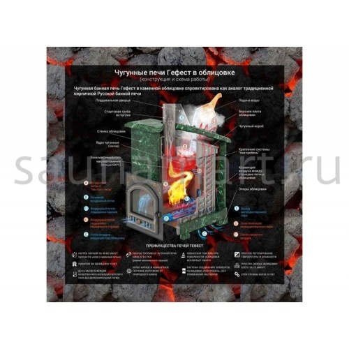 GFS-ЗК 40 (М) - печь с усиленной каменкой большей массы, с единым углублением внутрь топки для дополнительной укладки чугунного заряда. Теплосъемные шипы, со стороны горения пламени, в разы увеличивают площадь соприкосновения огня с каменкой и ускоряют передачу тепла, а также способствуют лучшему дожигу, смешивая потоки пламени и воздуха, поступаемого из воздушника. Эти усовершенствования значительно повышают мощность парообразования печи и выдают большее количество пара при непрерывной подаче воды. Каменка печей GFS-ЗК является незаливаемой.