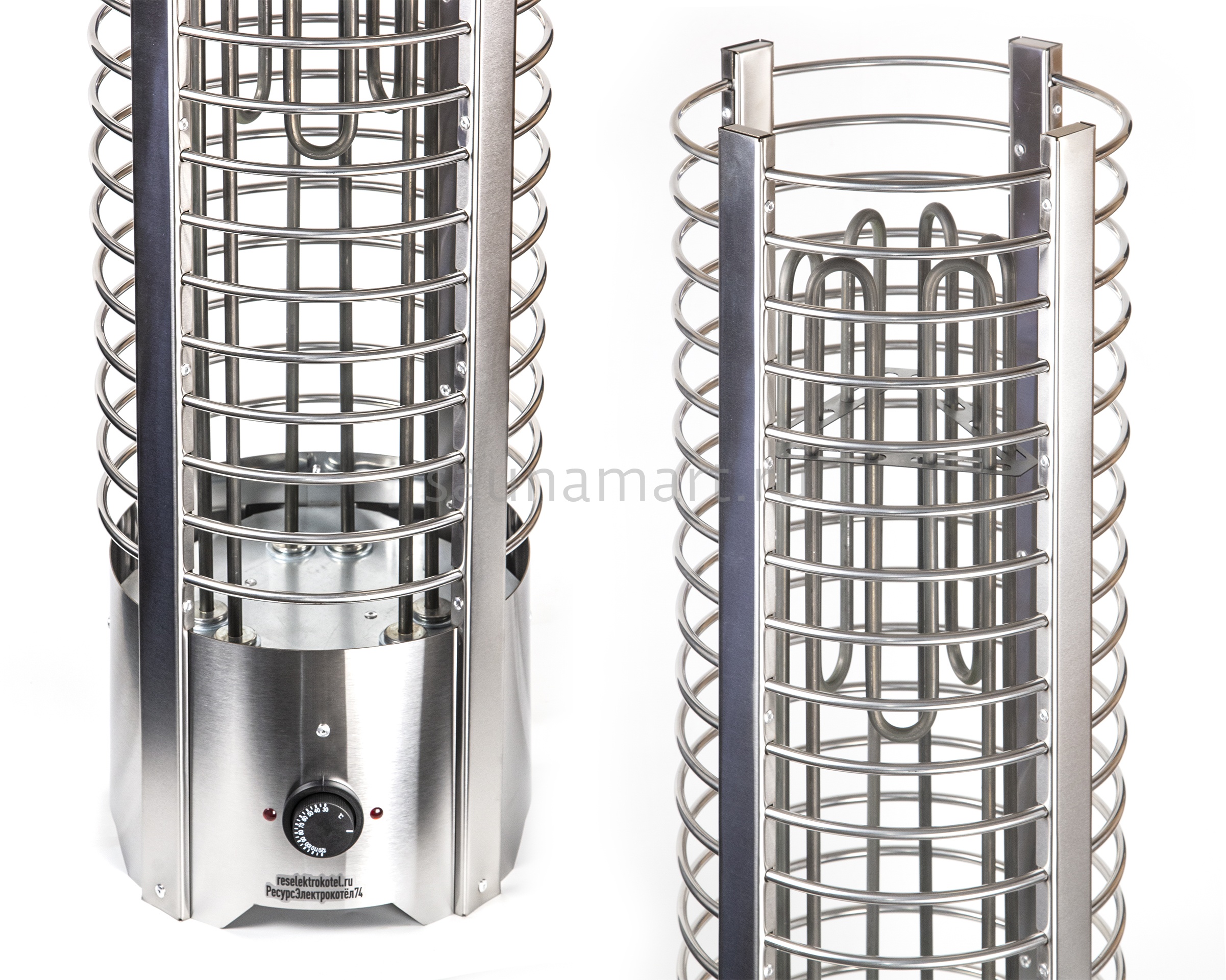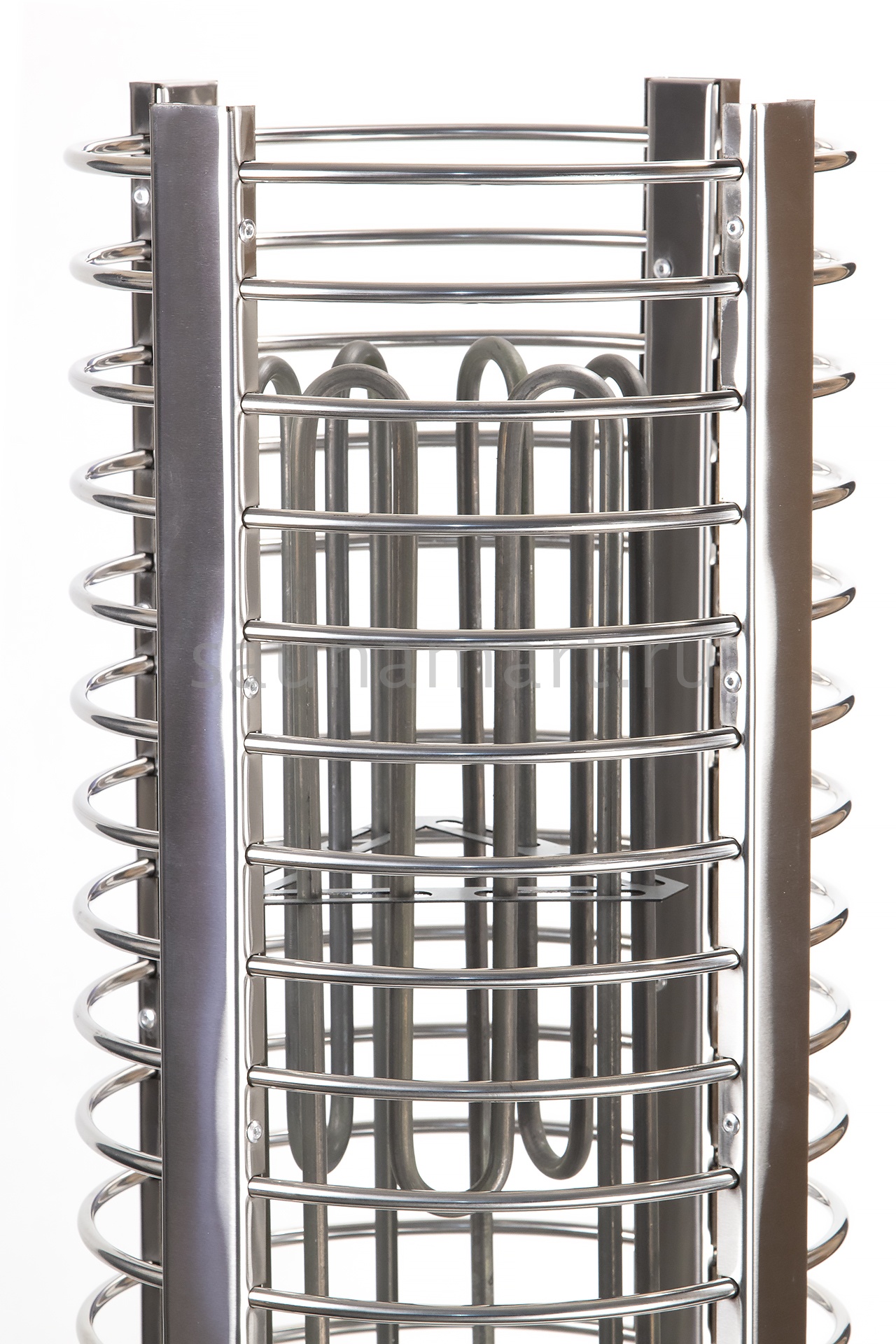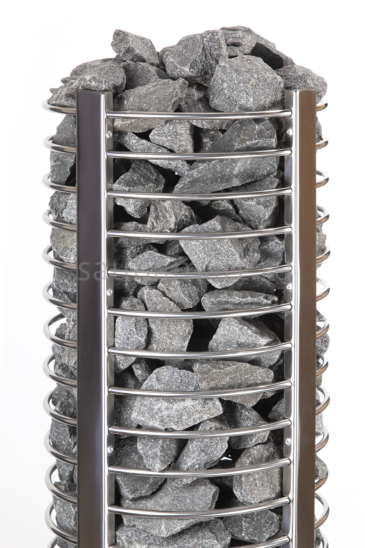 Печь комплектуется выносным пультом управления с 5-метровым кабелем. Нагревательные элементы (ТЭНы) изготовлены из нержавеющей стали AISI 304. Вариант размещения - напольный, требует монтажа на негорючее основание. Каменка открытого типа с верхней загрузкой. Имеется встроенный пароиспаритель с механическим клапаном регулировки пара. Дополнительно: защита от перегрева и система аварийного отключения.