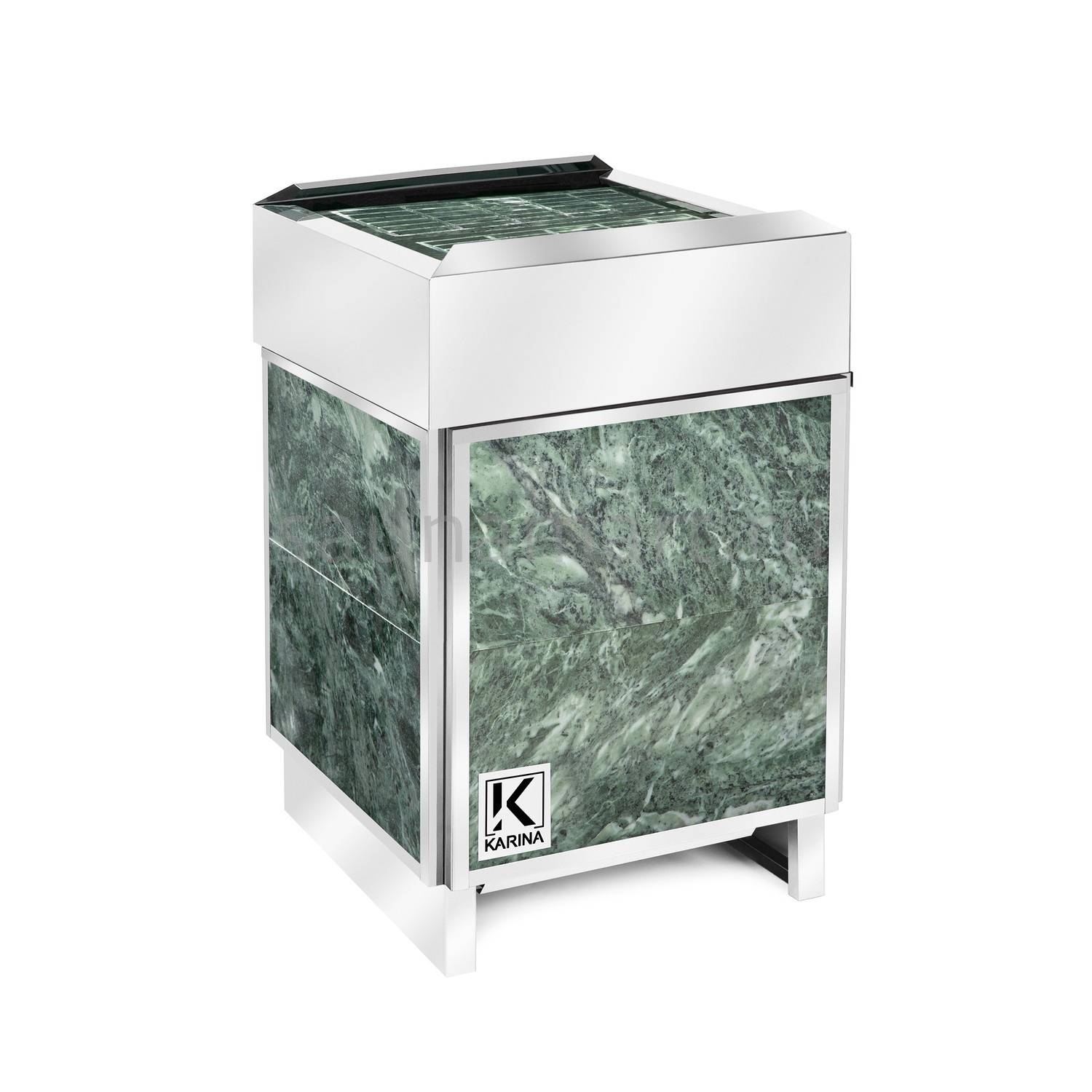 Электрическая печь KARINA Elite 8 Змеевик обладает оригинальным и современным дизайном. Благодаря своему стильному корпусу, она будет замечательно смотреться в интерьере любой бани. Мощность данной электрокаменки составляет 8 кВт, это позволяет ей прогревать помещение объемом до 12 куб. м.