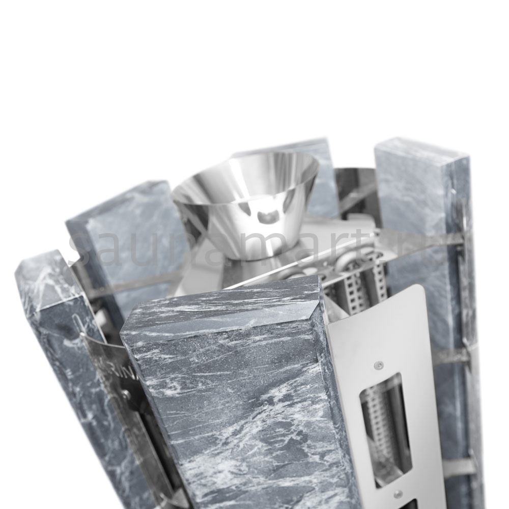 Все корпусные элементы печи выполнены из нержавеющей стали. Нагревательный элемент - ТЭН диаметром 10мм. Наружный кожух каменки дополнительно облицован плитами из Змеевика толщиной 40мм, что придает ей еще большую теплоемкость и меньшее излучение от металлических элементов, которые выжигают воздух в парной. Общий вес камней – 205кг (120кг – загрузка камней в печь и 85кг - вес облицовки), что сопоставимо с закладкой камней в хорошую дровяную печь. Тем самым с помощью парогенератора, закрытой каменки и закладки камня в 205 кг, легко достигается режим настоящей русской бани.