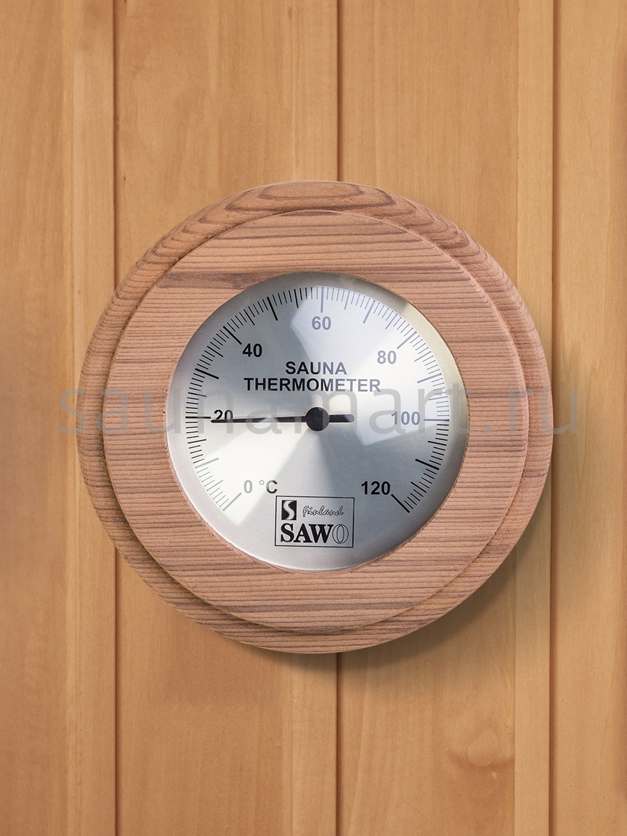 Sawo Термометр 230-ТD отличается надежностью, долговечностью и практичностью. Корпус прибора выполнен из кедра, очень прочного материала, который не выделяет смолы. Диаметр 13,5 см. В широкой раме из кедра находится круглый циферблат, под жаропрочным стеклом. Градуировка шкалы термометра варьируется в пределах от 0 до 120 градусов по Цельсию. Этого максимума достаточно для комфортных банных процедур. Нагнетание в парном помещении большей температуры нежелательно, так как может быть опасно для здоровья. Предусмотрена возможность калибровки прибора. Термометр SAWO прекрасно впишется в интерьер любой бани или сауны. Термометр Саво подойдет для использования в любом парильном помещении, как в условиях русской бани, финской сауны так и хамама. Помните,  чтобы проведённое в парной время оказало благоприятный эффект на здоровье и самочувствие, необходимо тщательно соблюдать температурный режим парения.  Высокий стандарт качества SAWO гарантирует надежность и точность измерений термометра.
